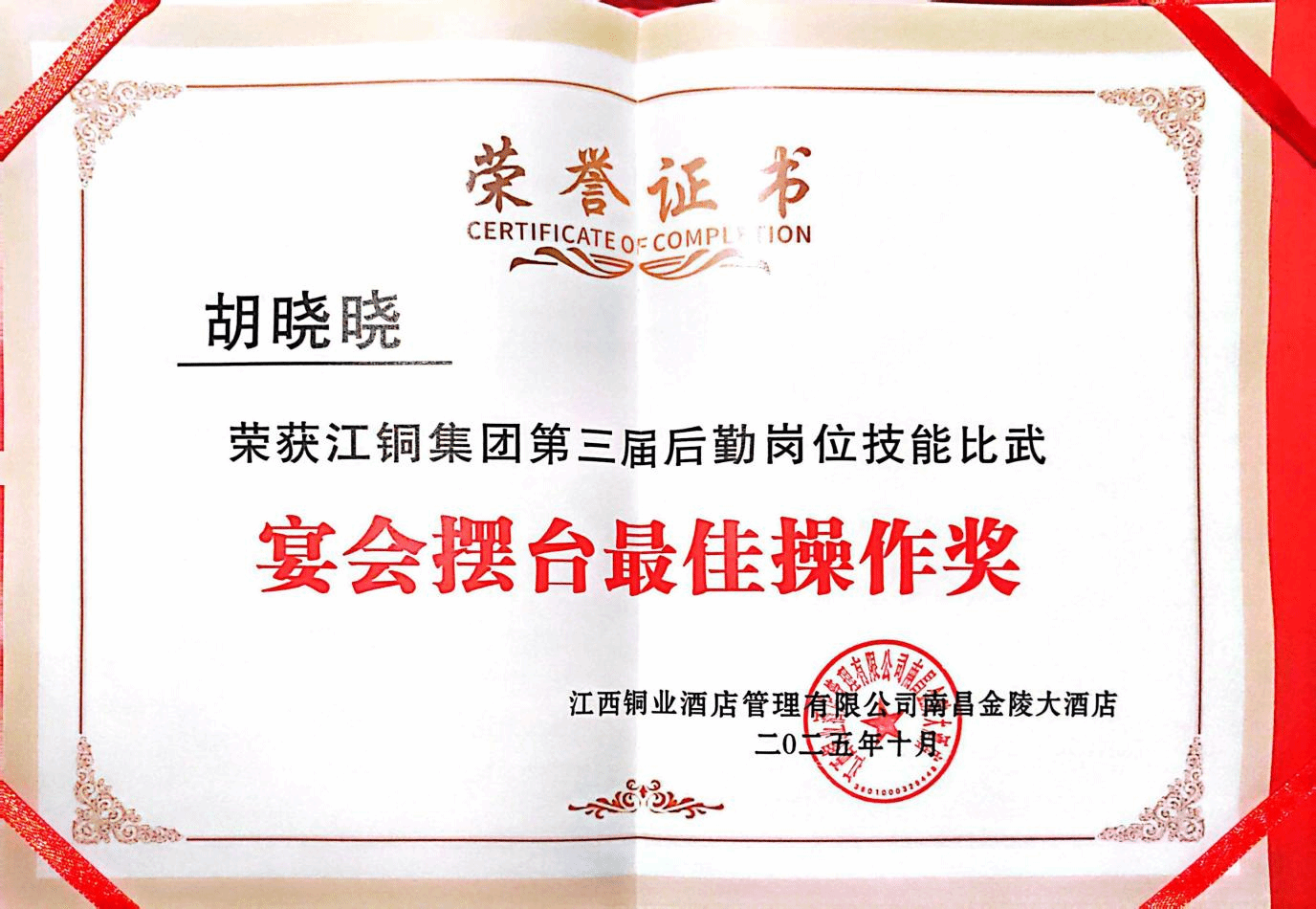 近日,由江西铜业股份有限公司工会委员会主办、江西江铜物业有限公司工会委员会承办的江铜集团第三届后勤岗位技能比武在南昌金陵大酒店举行。学校社会服务学院24级酒店与数字化运营专业学生胡晓晓在比赛中发挥出色,荣获“宴会摆台最佳设计奖”“宴会摆台最佳操作奖”两项殊荣,充分展现了我校学子精湛的专业技能与良好的职业风采。